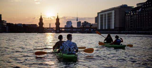 Wenn der Tag zur Ruhe kommt, beginnt das Beste: Mit dem Kanu oder Kajak gleiten Sie auf der Spree nordwärts, vorbei an der Insel der Jugend und der Halbinsel Stralau bis hin zum Molecule Man. Der Guide begleitet Sie durch ein abendliches Berlin, das in warmem Licht erstrahlt – unvergesslich, entspannt und fernab des Stadttrubels.